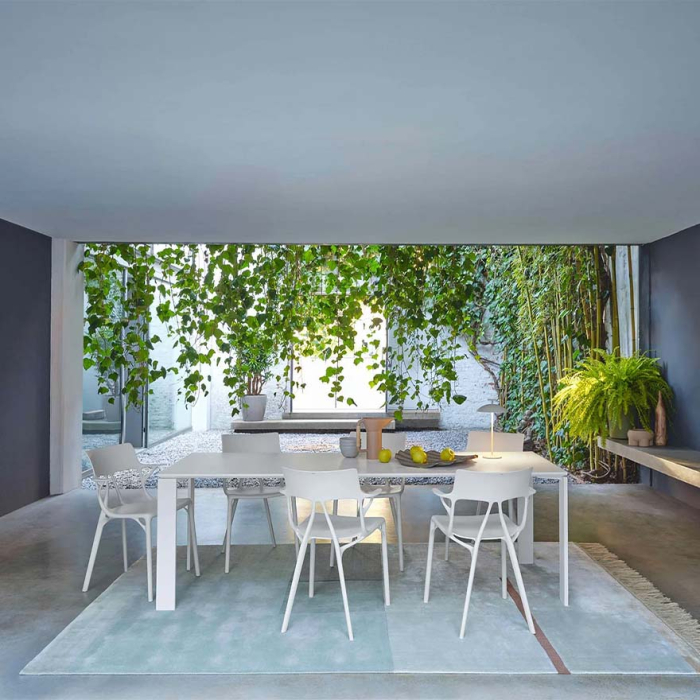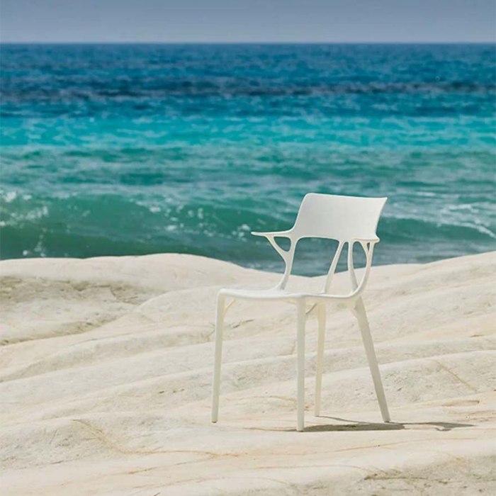 Kartell continues its ongoing commitment to sustainability with eco-friendly products which are part of the broader project expressed by the industrial manifesto Kartell loves the planet. A.I. is the chair created for the first time ever using recycled material, in which aesthetics and structural requirements remain unaltered, blending seamlessly with generative design. The added value of A.I. lies in the fact that it is the first product family conceived by Artificial Intelligence in response to input received from the designer (Philippe Starck) and the know-how of the company (Kartell). Specifically, creative thinking, company know-how and artificial intelligence have merged to develop a chair model based on an algorithm that respects the original brief of the designer and the company a comfortable product with the structural strength and solidity required while upholding one of Kartell's main values: to be an injection-moulded industrial product of outstanding aesthetic quality.