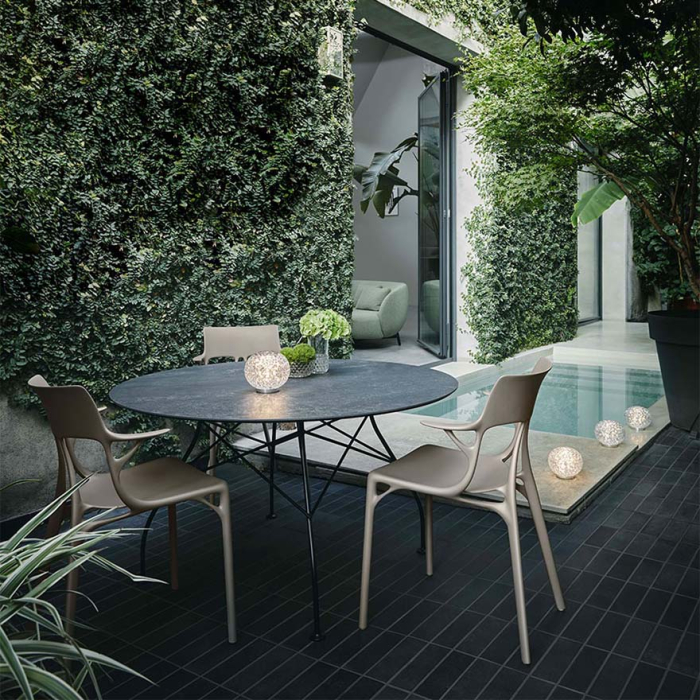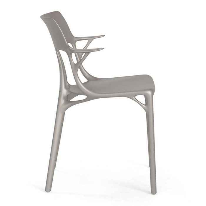 Kartell continues its ongoing commitment to sustainability with eco-friendly products which are part of the broader project expressed by the industrial manifesto Kartell loves the planet. A.I. is the chair created for the first time ever using recycled material, in which aesthetics and structural requirements remain unaltered, blending seamlessly with generative design. The added value of A.I. lies in the fact that it is the first product family conceived by Artificial Intelligence in response to input received from the designer (Philippe Starck) and the know-how of the company (Kartell). Specifically, creative thinking, company know-how and artificial intelligence have merged to develop a chair model based on an algorithm that respects the original brief of the designer and the company a comfortable product with the structural strength and solidity required while upholding one of Kartell's main values: to be an injection-moulded industrial product of outstanding aesthetic quality.