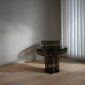 Where timeless elegance meets architectural inspiration in mouth-blown glass. Each table is a single, sculptural piece, featuring a circular tabletop supported by four merged cylindrical legs. Drawing from the raw forms of Brutalist architecture, the design highlights the beauty of columns while embracing minimalist aesthetics. Available in two sizes and two unique colors. Crafted from mouth-blown glass heated to 1500 degrees, the table takes shape in a custom mold before being tempered for strength. The base is precision-cut, and the inner surface spray-painted for its signature color. The glass table is mounted on a sturdy wooden base with internal metal support, ensuring both stability and durability. With its sculptural form and refined craftsmanship, the Crown Table is a striking yet versatile piece, perfect for elevating both residential and commercial spaces.