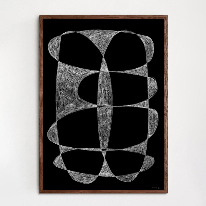 This Atelier Cph print brings together looping abstract shapes in a repeating pattern, giving it a sense of movement and rhythm. The detailed white chalk lines work sharply with the dark background, creating depth and texture. The organic curves in a symmetrical arrangement creates a meditative visual effect.