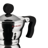 The Moka Alessi coffee maker, created by Alessandro Mendini, has a round shape that expresses its relationship with the traditional moka. An espresso coffee maker in aluminium casting with an ergonomic handle and thermoplastic resin knob. A real and proper eulogy to the daily coffee rite.