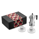 Set composed of 'Pulcina' espresso coffee maker in aluminium casting, handle and knob in PA, black, magnetic steel bottom suitable for induction cooking, 3 cups (MDL02/3BFM) and 'PlateBowlCup' two mocha cups with saucers in white porcelain.