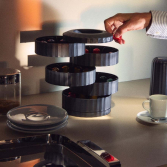 An indispensable accessory for keeping your favourite coffee capsules handy and tidy at all times. This practical container looks like a model of a modern building and leaves no doubt as to its originator: Michele De Lucchi. A functional and fascinating object: the mechanism for opening the five compartments in which the capsules are stored offers a pleasant and somewhat surprising user experience thanks to the playful use of dynamic volumes.