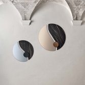 The Luxor by Bontempi Casa is a statement circular mirror, with two separated halves joined by a smaller round decorative detail in a wood or marble ceramic finish. The sectioned, ying-yang inspired design can be selected in contrasting or complementing finishes, with both halves mirrored or with one mirrored and one in marble ceramic.