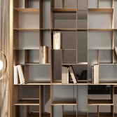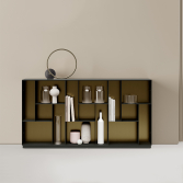 The wall-secured Atena Bookcase is a customisable design by Bontempi Casa featuring a pattern of rectangular shelf sections. A single modular unit can be repeated for bespoke configurations, with optional added back panels as desired. Suggested compositions include low versions with a base and added glass top, or larger versions without. Please note, wall anchorage is required.