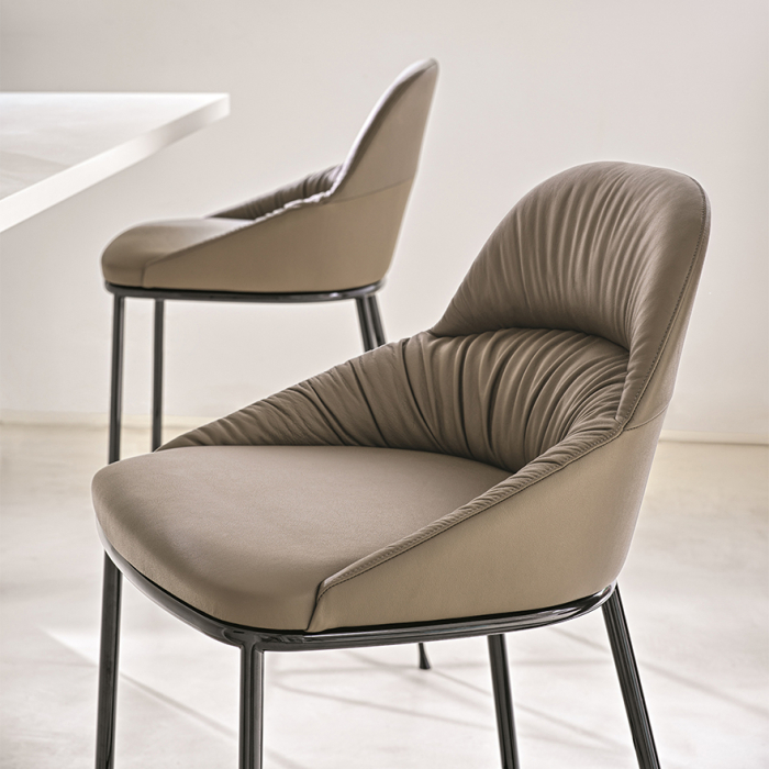 The Bontempi Casa Queen Bar Stool is a stylish upholstered design featuring a gathered seat finish in a choice of fabrics and leathers supported by an elegant tapered frame legs can be selected in a range of lacquered metal colourways.