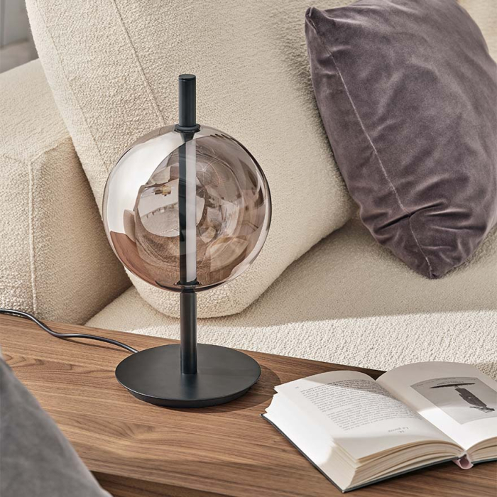 The Sferatus Table Lamp by Bontempi Casa is a neat table lamp design featuring a single glossy borosilicate glass sphere partially coated with a mirror finish, housing a strip LED light.