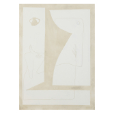 Consume by French artist Hubert Mardi lies between realism and abstraction through a built-up composition of everyday moments and motifs. Three abstracted windows in white appear through the beige backdrop, layers of acrylic paint removed through engraving techniques to reveal several motifs - a seated figure, a strand of grass, a ceramic pot. These slices of familiarity sit within the hand-drawn windows, with layers of varnish adding texture and depth to the painted surfaces.