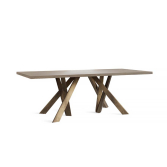 A Dining table with steel legs and wooden details. Available in various surface materials.