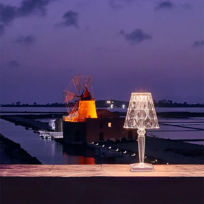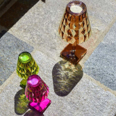 Battery is a compact table lamp innovatively characterised by the fact that it is 100% rechargeable thanks to a simple electric plug, with up to eight hours of battery life. This makes it easy to move, ideal for temporary contract set-ups, for use in cafes or in open air restaurants.