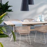 Embodying the harmony of nature and modern design, the Arioso dining table is a masterpiece of craftsmanship. Constructed from natural teak, renowned for its durability and elegance, it stands on sleek metal legs that add a touch of contemporary flair. This eco-friendly table is more than just a piece of furniture; it's a statement of style and sustainability. Its design is a nod to modern aesthetics, yet it doesn't compromise on the timeless appeal of natural materials.
