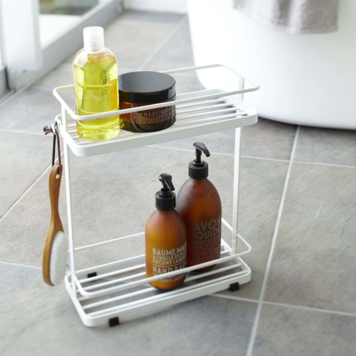 Make a splash with this shower caddy. Skip the wall holder and opt for a free-standing caddy with plenty of room for bottles and soaps. If you have lotions galore spilling over your bathtub, try a freestanding caddy like this one to organize and declutter your bath area, because you deserve as many shampoos, soaps, and rubber duckies as you want! Hooks to hold loofahs, brushes, and other scrubbing devices. This two-level shower caddy keeps all of your shower items safe and organized if you're low on space in the bathroom. Store shampoos, conditioners, even rubber duckies, close at hand. Hooks offer a handy way to store hairbrushes and loofahs. Designed to be stored inside the shower or alongside a bathtub.
